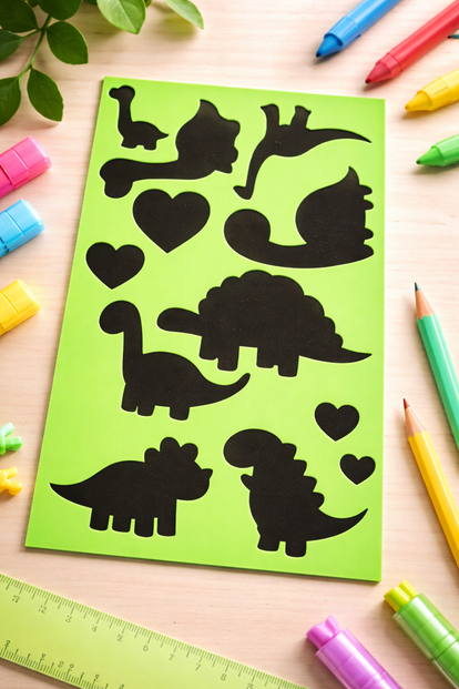 Laat kinderen hun creativiteit ontdekken met deze leuke dinosaurus tekensjabloon! Met verschillende dinosaurusvormen en hartjes kunnen kinderen eenvoudig de mooiste tekeningen maken.