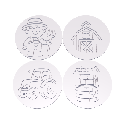 Met deze set van 4 boerderij‑stempels ontdekken kleuters spelenderwijs het leven op de boerderij. Ze stempelen een boer, een schuur, een tractor en een waterput.