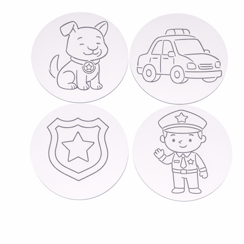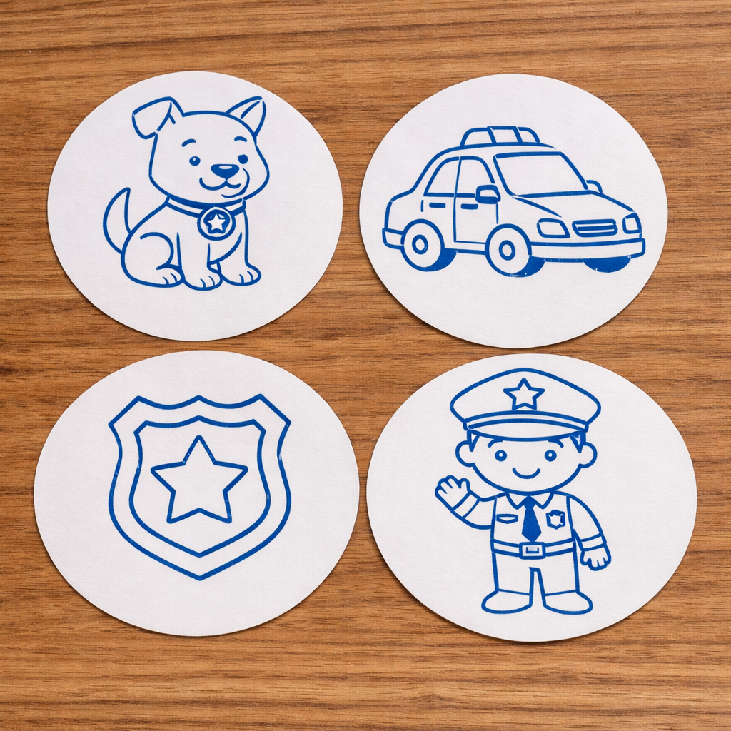 Maak kennis met onze vrolijke stempelset: een zwaaiende agent, een trouwe politiehond, een stoere politiewagen en een herkenbare badge.